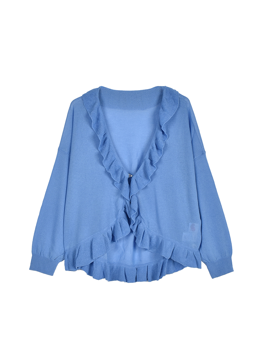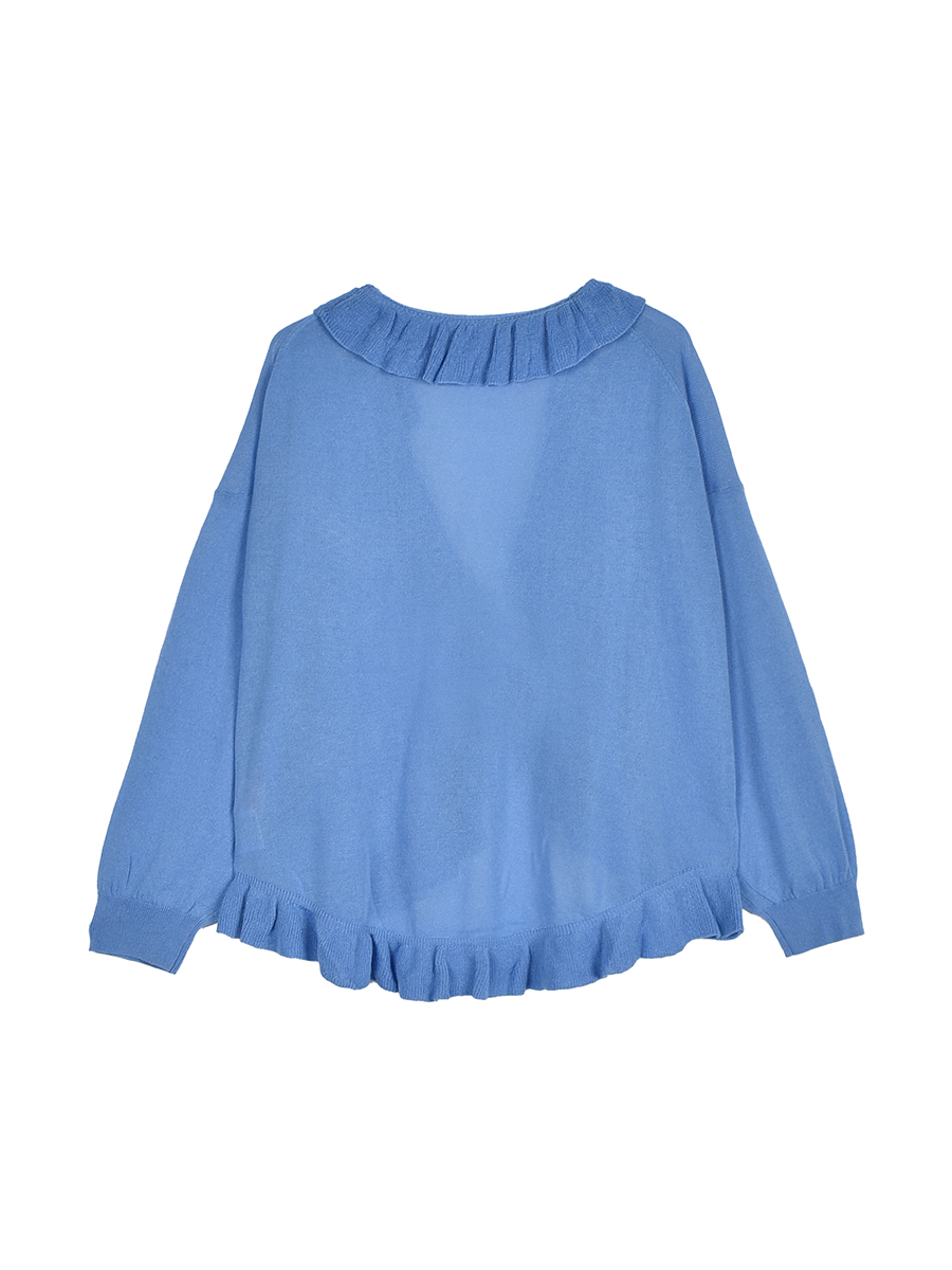 裾から衿ぐり(端一周)がつながっていてラッフルフリル切替になっています。袖口は1x1リブなので袖口の止まり位置を自由に変えられます。