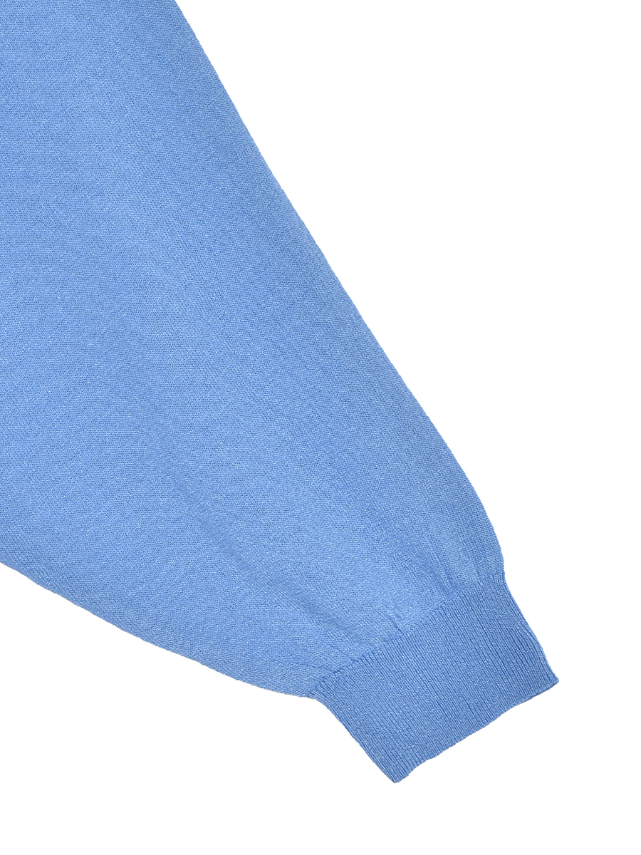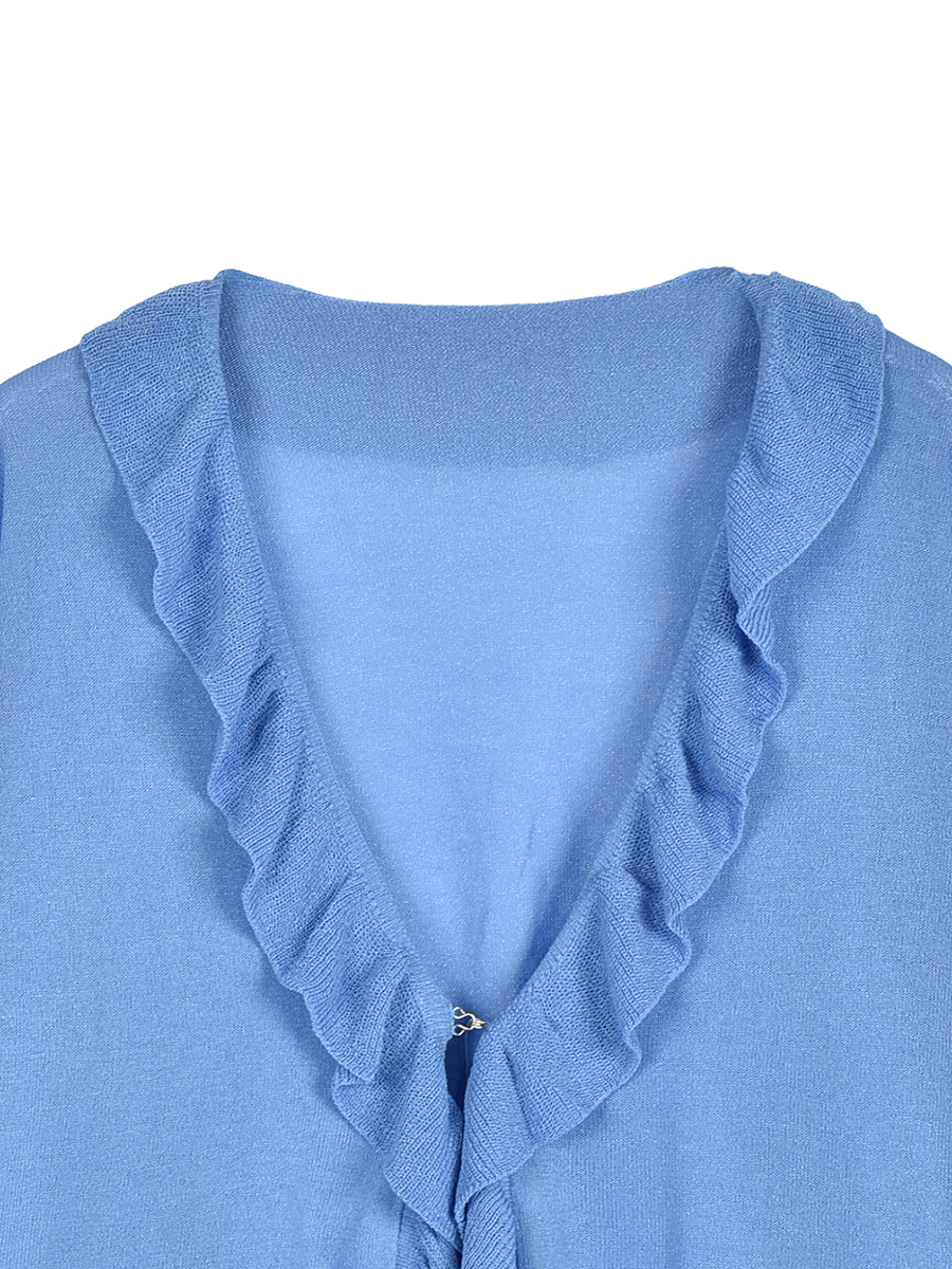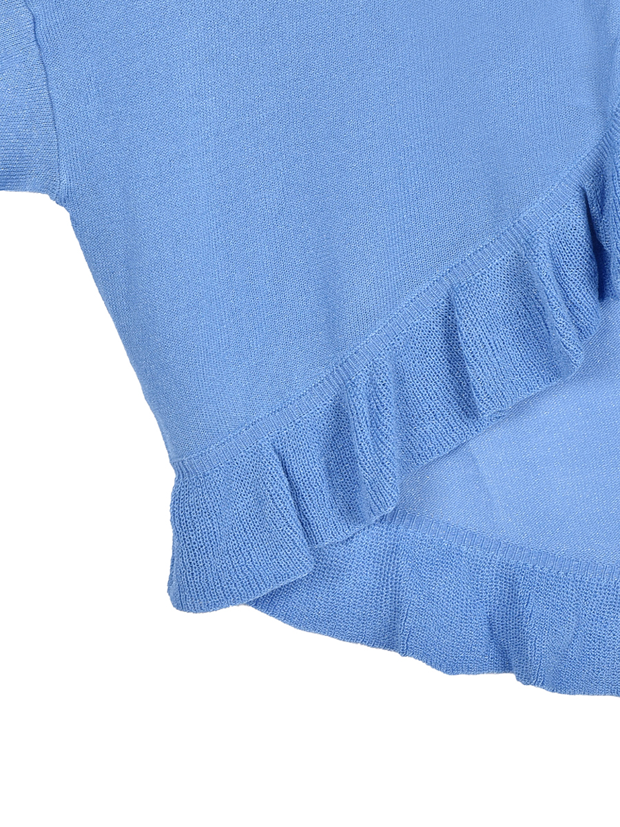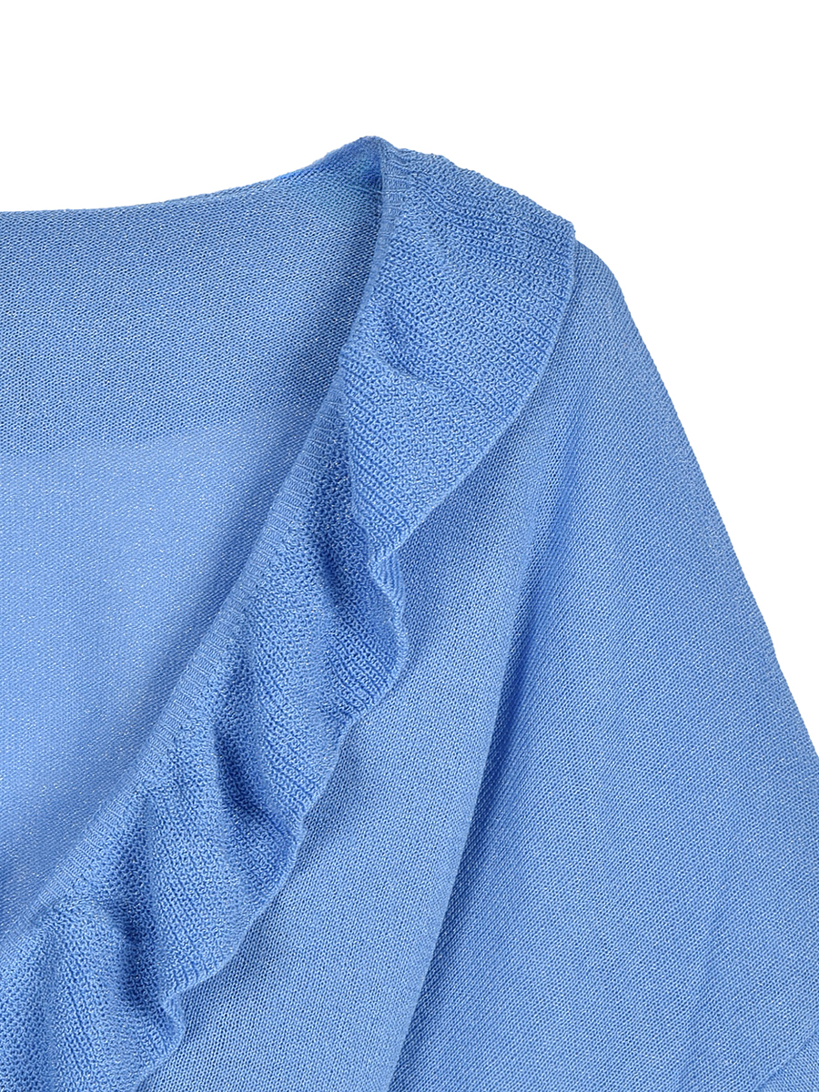 上品な光沢がラメのように入っているチクチクしにくいニット素材です。本体は14G天竺編みです。袖口は1x1リブでテンションを効かせました。フリルは畦編みで形状を作り出しています。