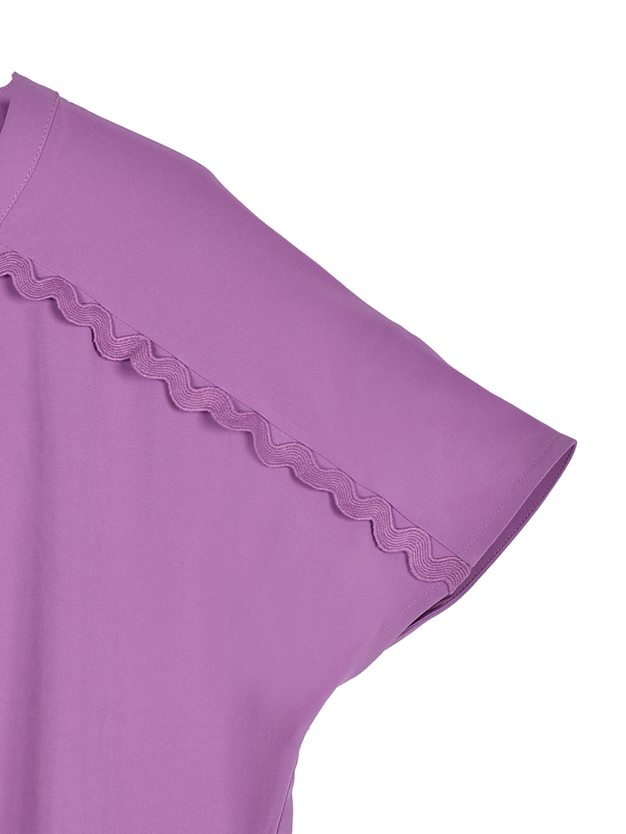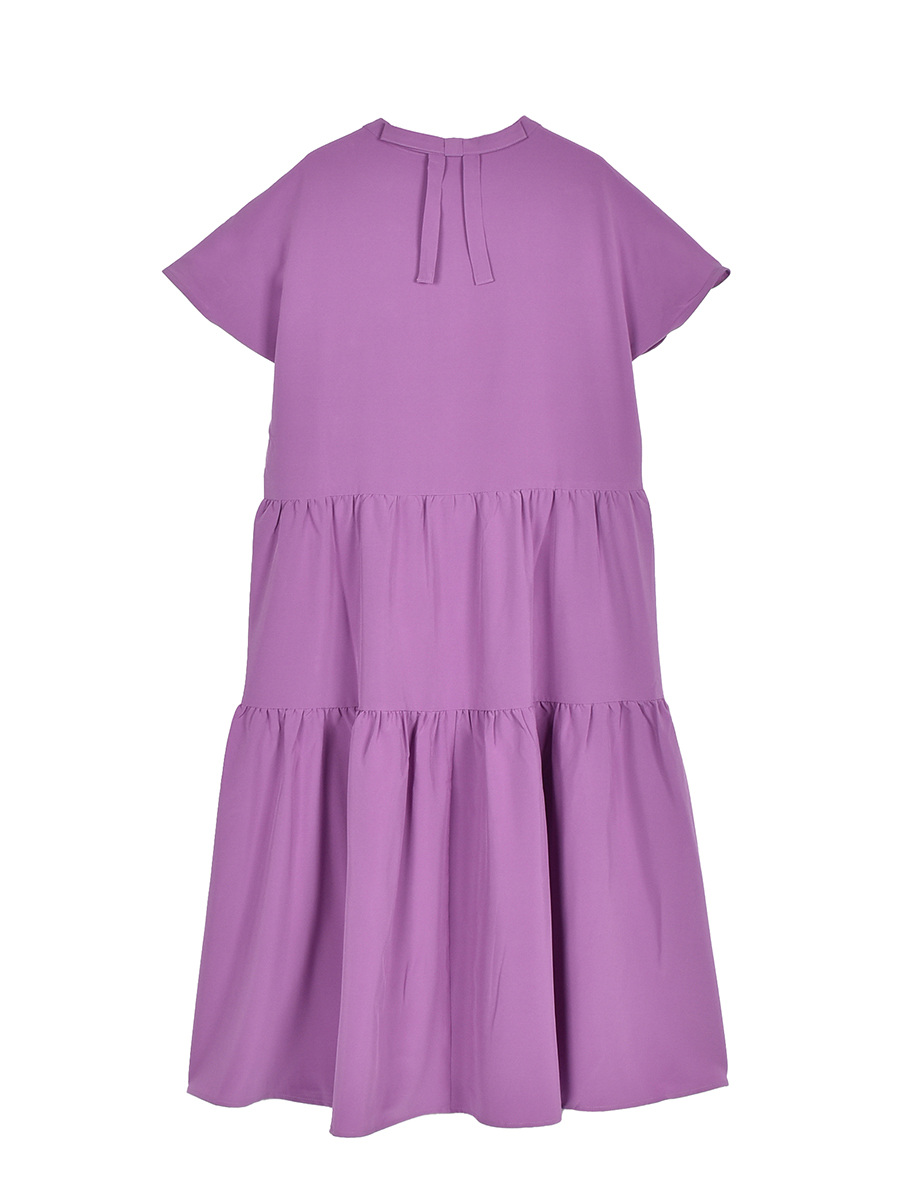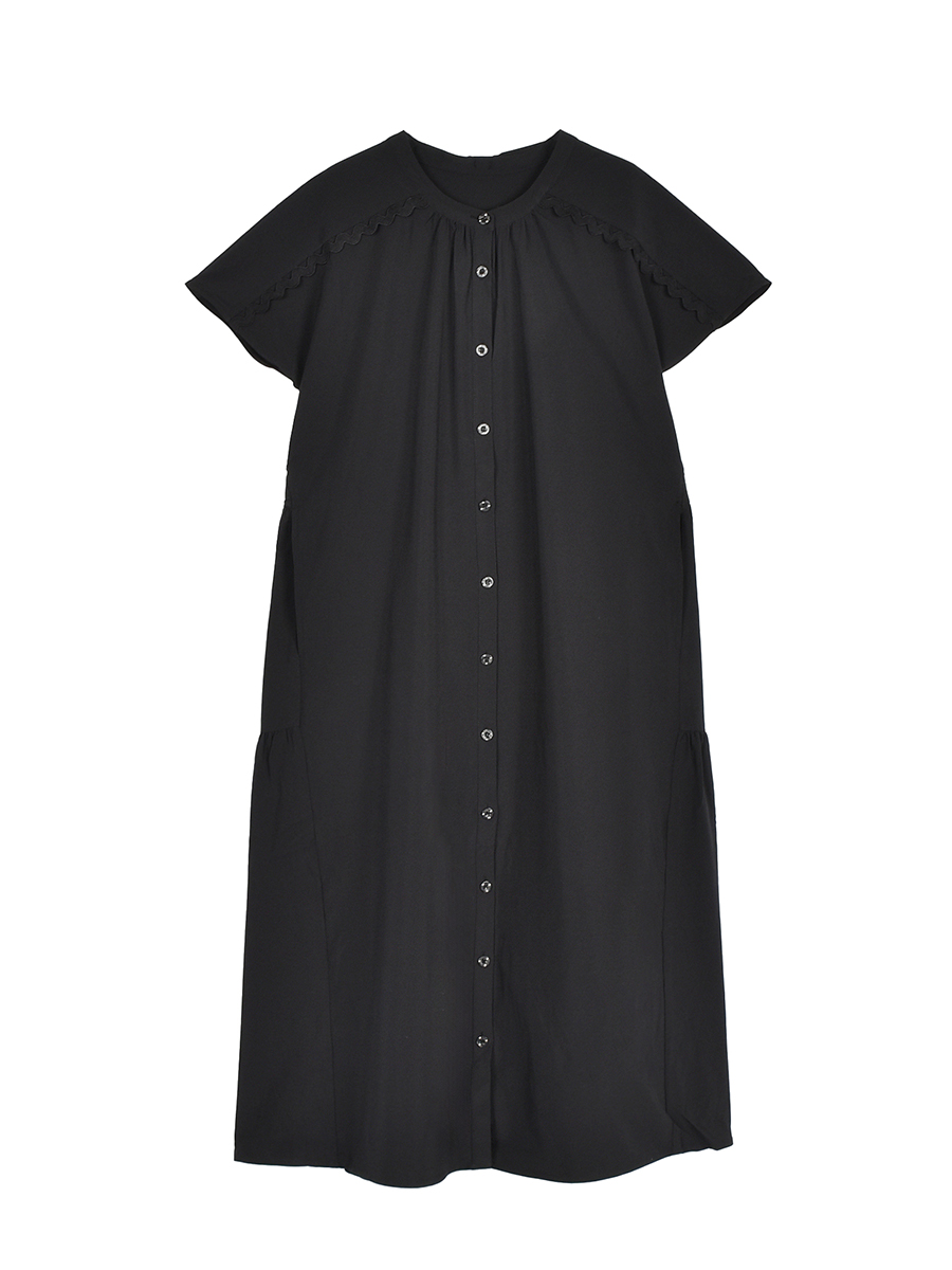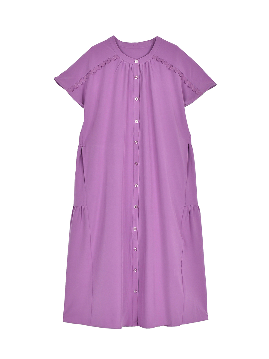 前身頃はシンプルに、後身頃はティアードデザインのワンピースです。肩にBIGスカラップレース(ケミカルレース)を配して、甘さをプラスしました。立体的なレースで高見えします。袖は長めのフレンチスリーブで二の腕辺りも気になりにくいです。前脇に縦に切替えを入れる事により細見え効果が期待できます。