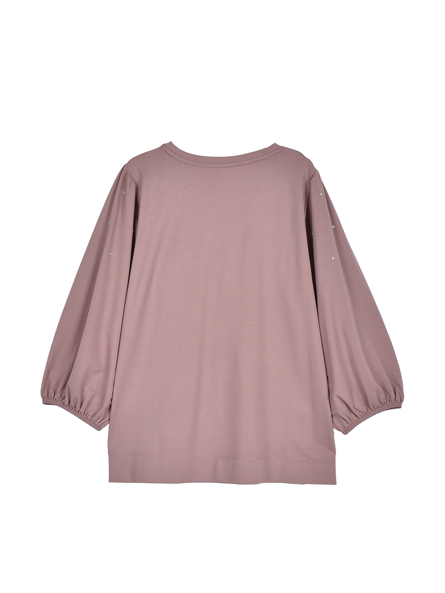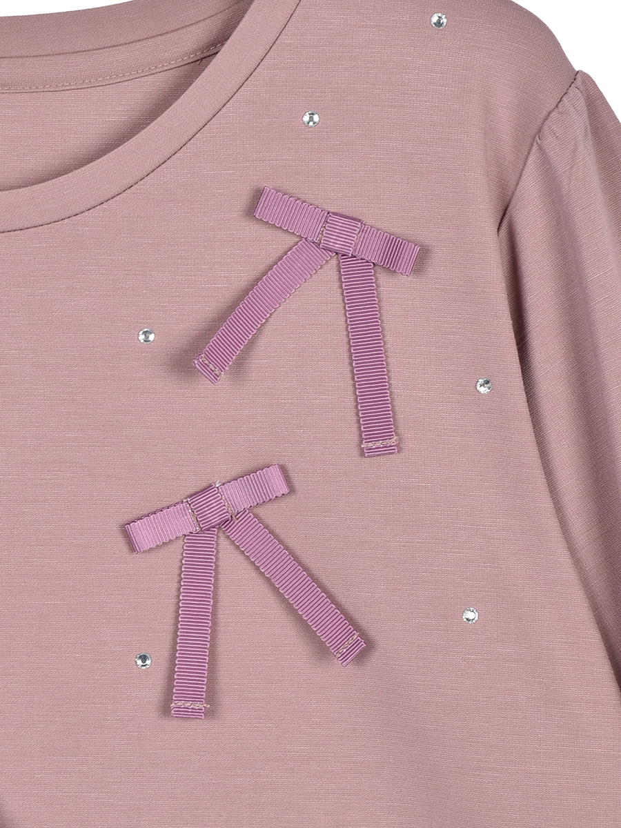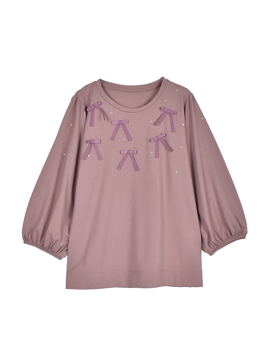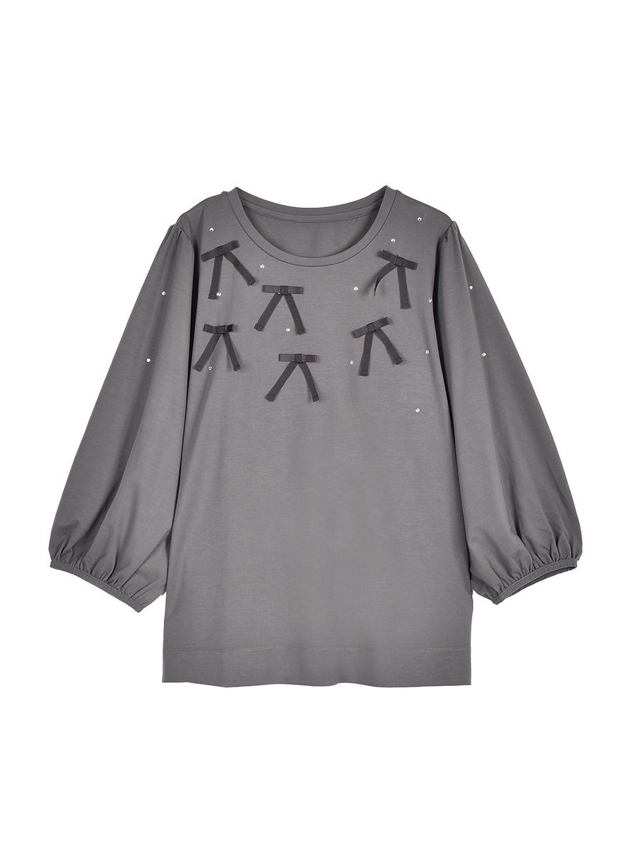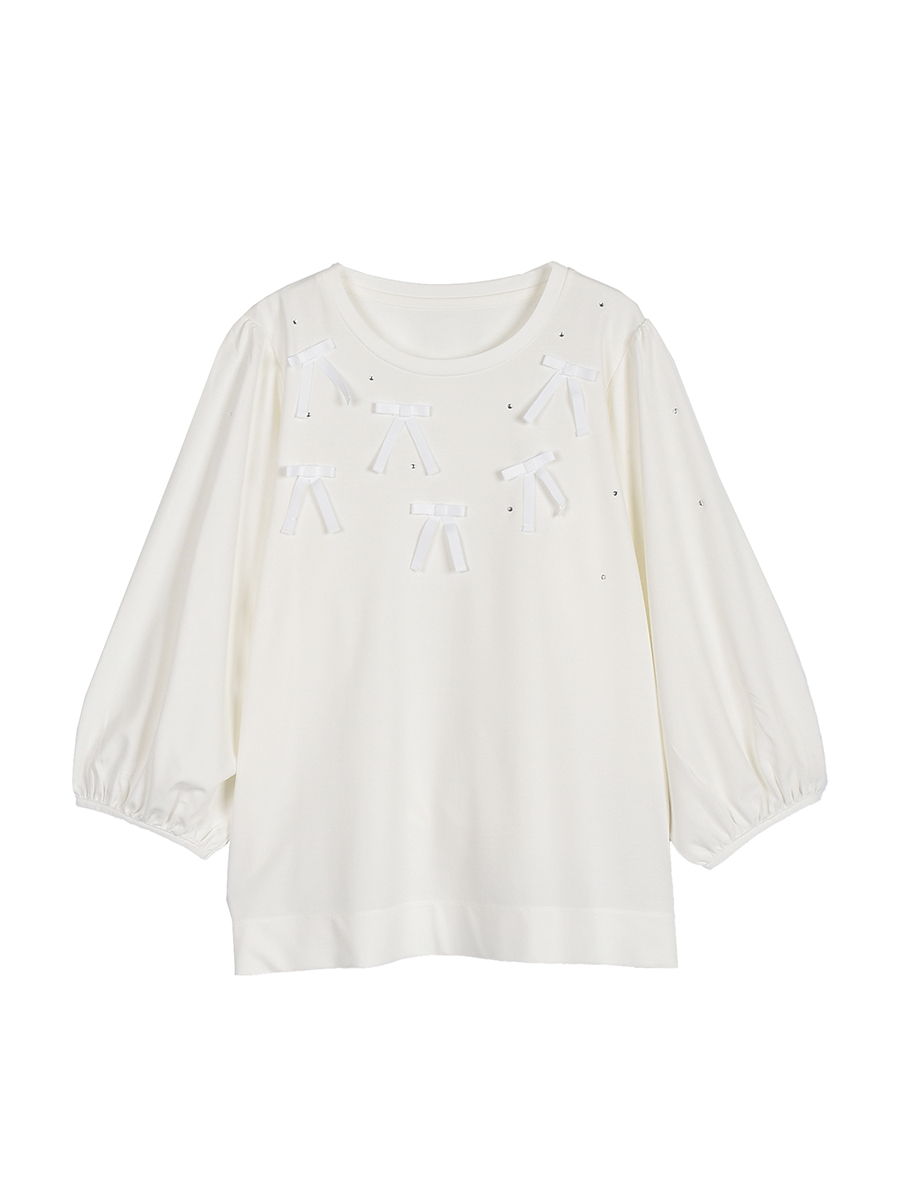 シルケット加工でキレイ目のカットソー天竺素材です。程よい肉感で肌離れも良く、サラッとした肌触りです。 ボックスシルエットのボディに袖山、袖口にギャザーをあしらったボリュームのある女性らしいパフスリーブが&LOVEらしい一枚です。肩幅は狭く華奢見えします。 フロントにリボン飾りを付けました。リボンの間にはクリスタル調ビジューを散りばめています。袖山もクリスタル調ビジューで飾っています。 袖口はニットバインダーで伸縮性があり、袖まくりが楽にできる仕様です。裾にスリットを入れより動きのあるデザインにしています。