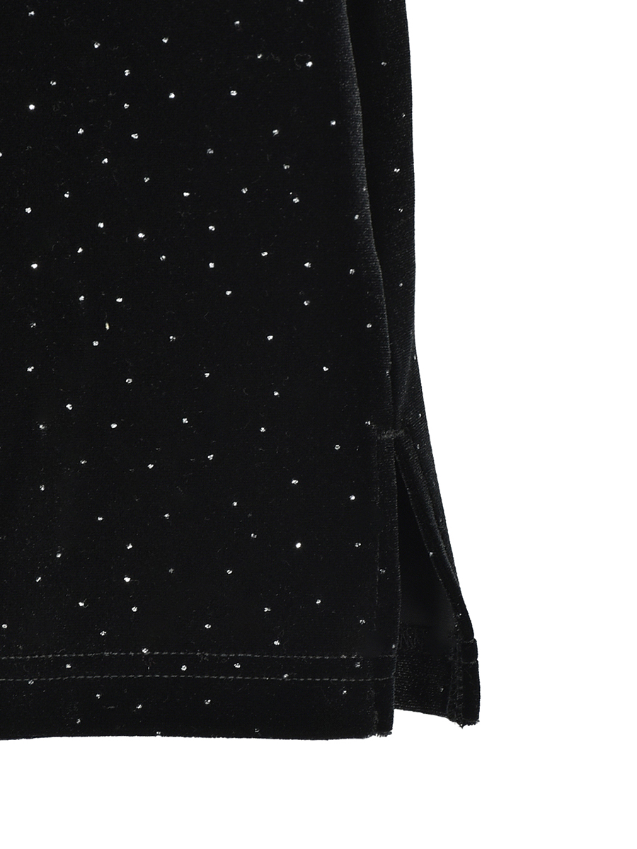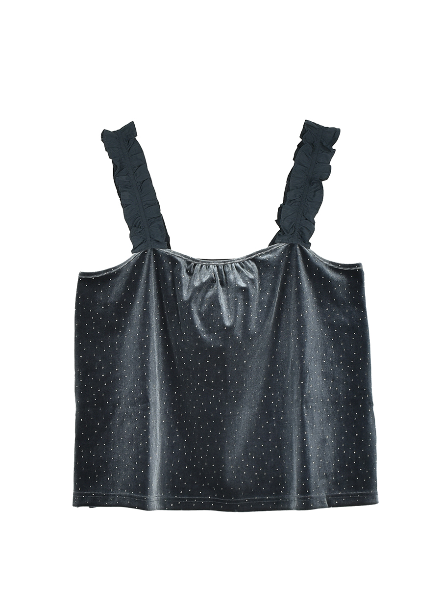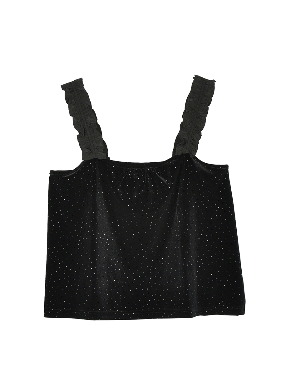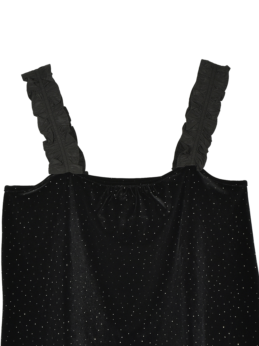 素材は柔らかなベロア素材を使用しております。表面が滑らかで触り心地良く、独特の光沢感があります。 全面グリッターラメドットプリントです。胸元はゆるめフィットから裾にかけて広がるAラインのシルエットになっております。 肩紐は別素材タフタを使用して贅沢ギャザーフリルになっております。前胸のみ胸元ギャザーを寄せております。裾両サイドはスリットデザインとなっております。