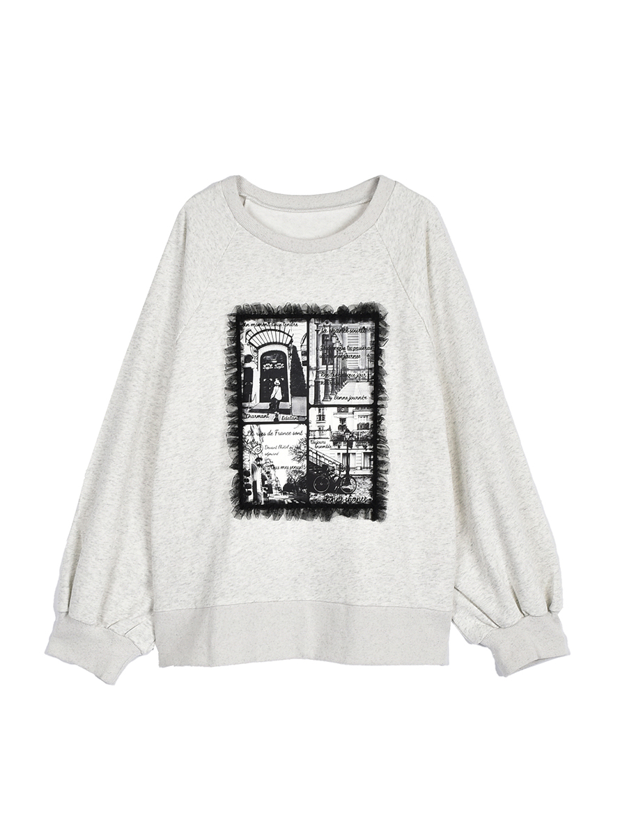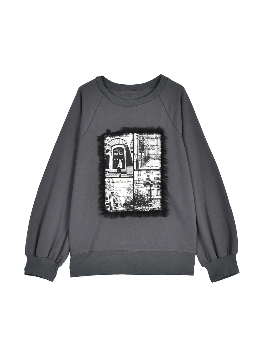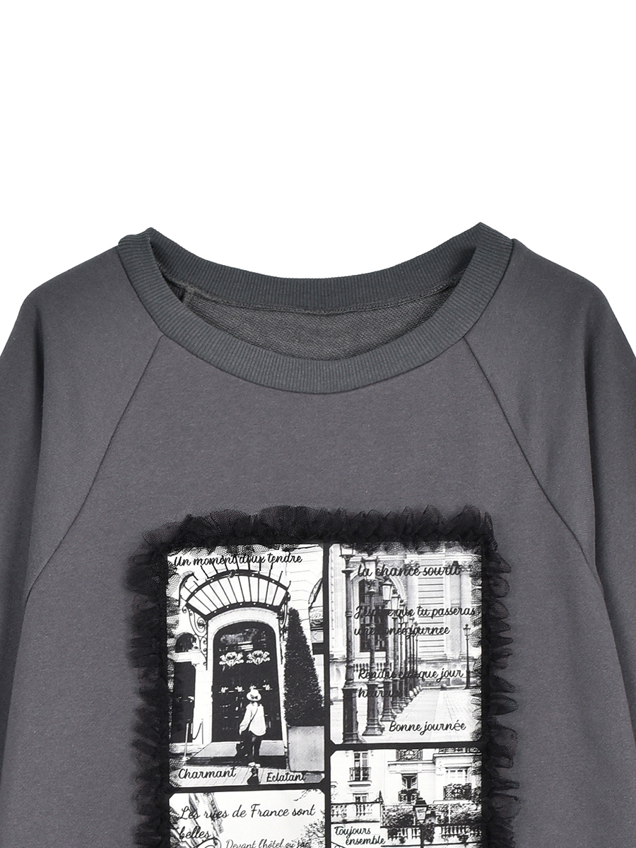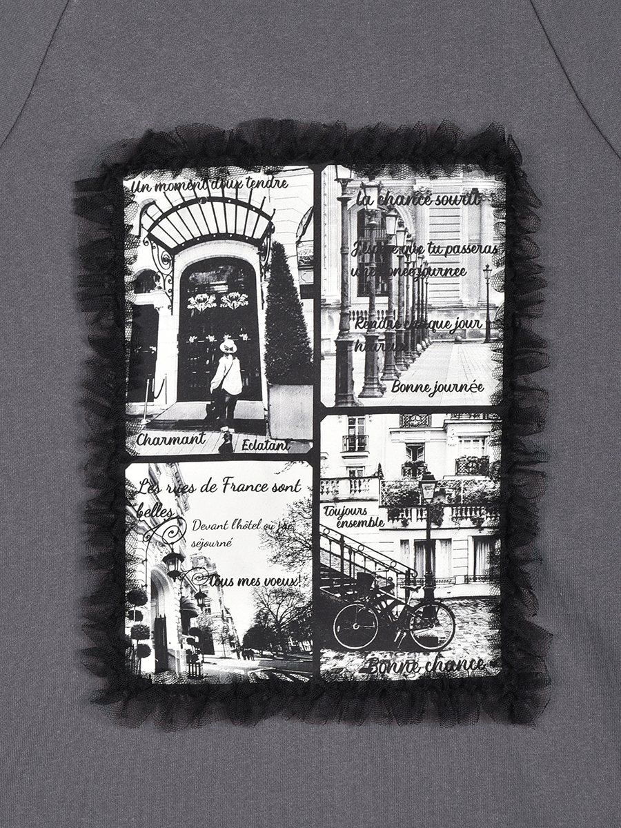 ミニ裏毛で厚すぎず、薄すぎず、長いシーズン着用いただけます。重ね着しても、もたつきにくい肉感です。衿ぐり、袖口、裾はリブ素材を使用しています。ゆったり目の身頃にラグランスリーブです。袖口はバルーンシルエットです。ラグラン線の角度を縦長に設定して細見え効果を演出しています。パリの画像を使用して&LOVEオリジナルのトレーナーを作り上げました。転写プリントの技法で周りをレースで飾り華やかに演出しています。