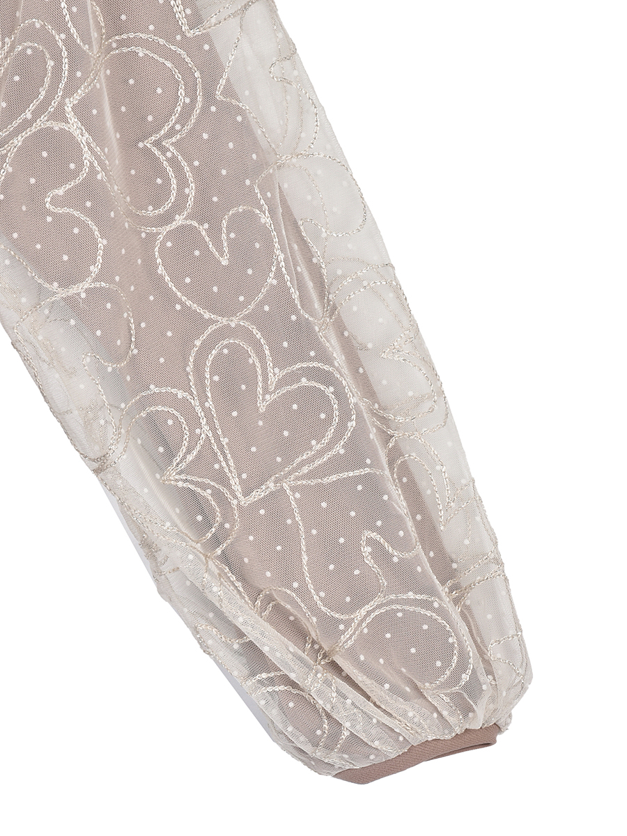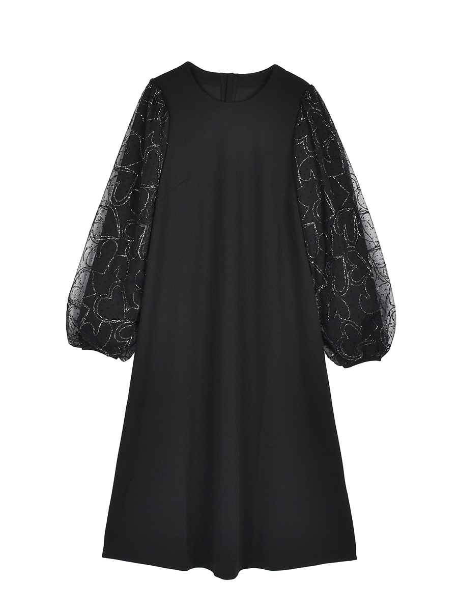 別布は柔らかい風合いのチュールを使用しています。フロッキープリントとハートの刺繍を施しているので、加工による張り感が特徴です。刺繍は&LOVEらしいハート柄の手書き風で甘すぎないラフな柄行がポイントです。きらりと光るシルバー糸がとても上品な仕上がりです。