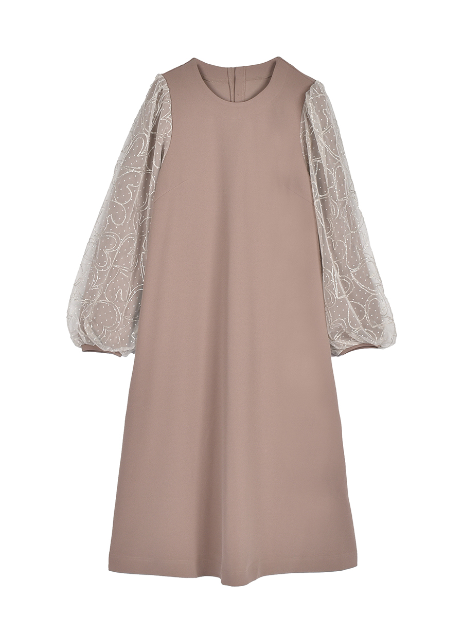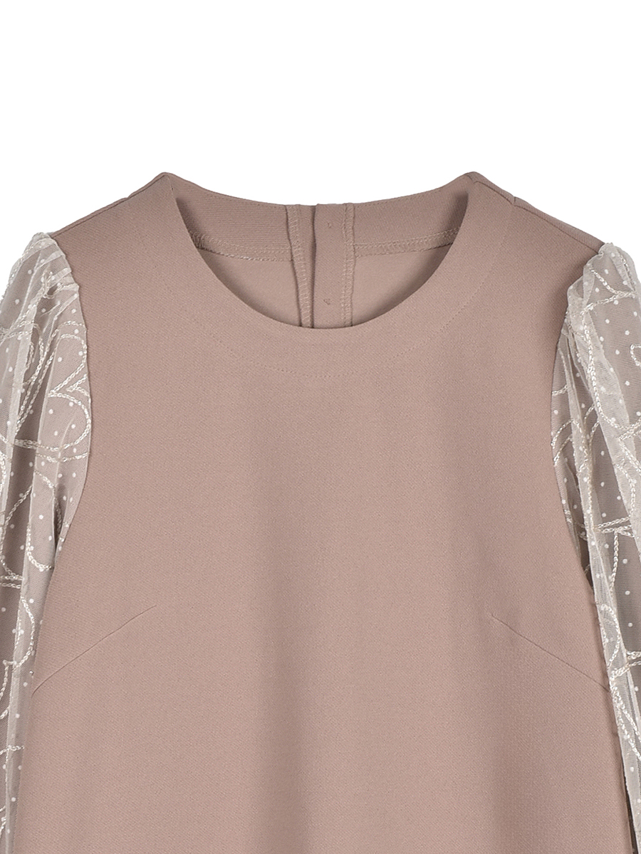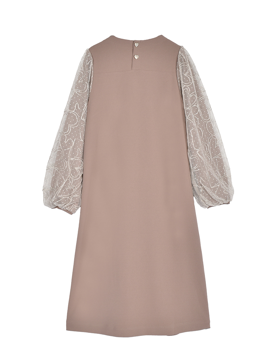 袖はデザインチュールを上に重ねた華やかなパフスリーブに仕上げました。本体の袖はすっきりとしたラインで、チュールはふんわりとボリューム感をだして大人が着易い優しいイメージです。
