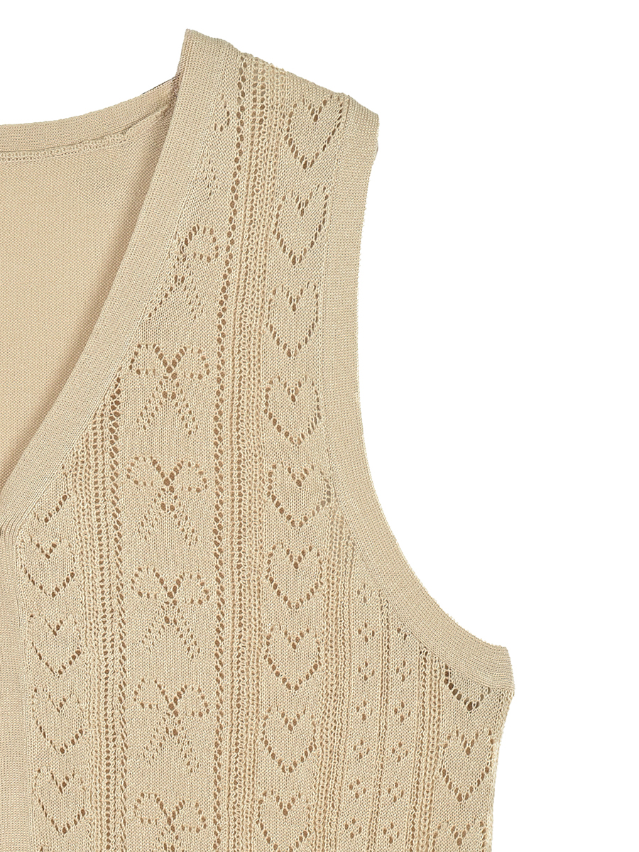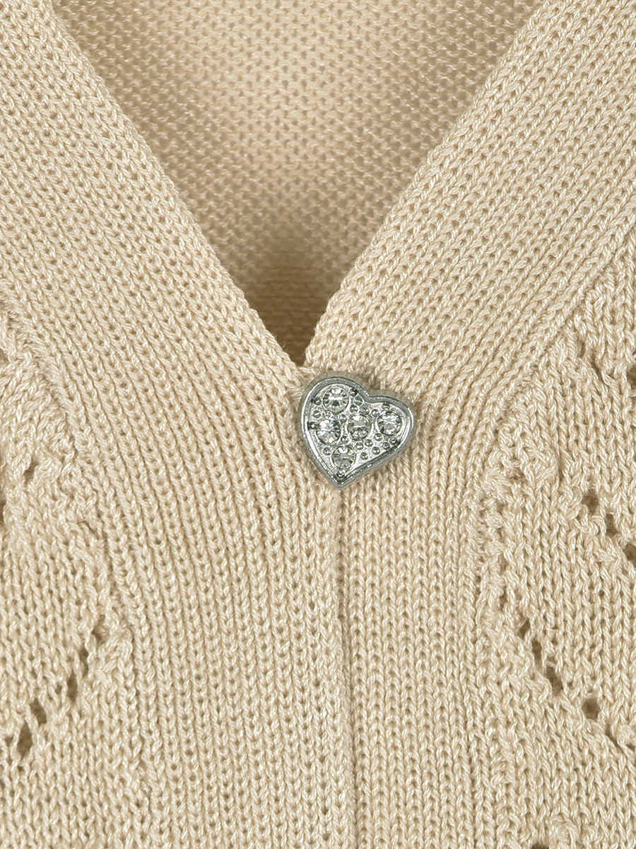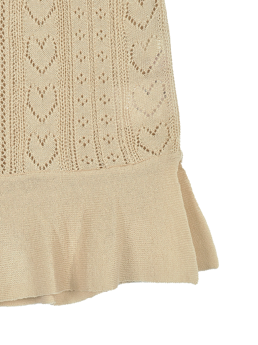 前身頃は透かし柄で軽やかに、後身頃は天竺編みでお作りしています。裾の総針フリルはひらりと広がり大人可愛いシルエットになっています。こだわりの柄にはリボン柄とハート柄を入れて&LOVEらしいラブリーさを表現しています。釦はハートのキラキラビジュー釦を使用しています。
