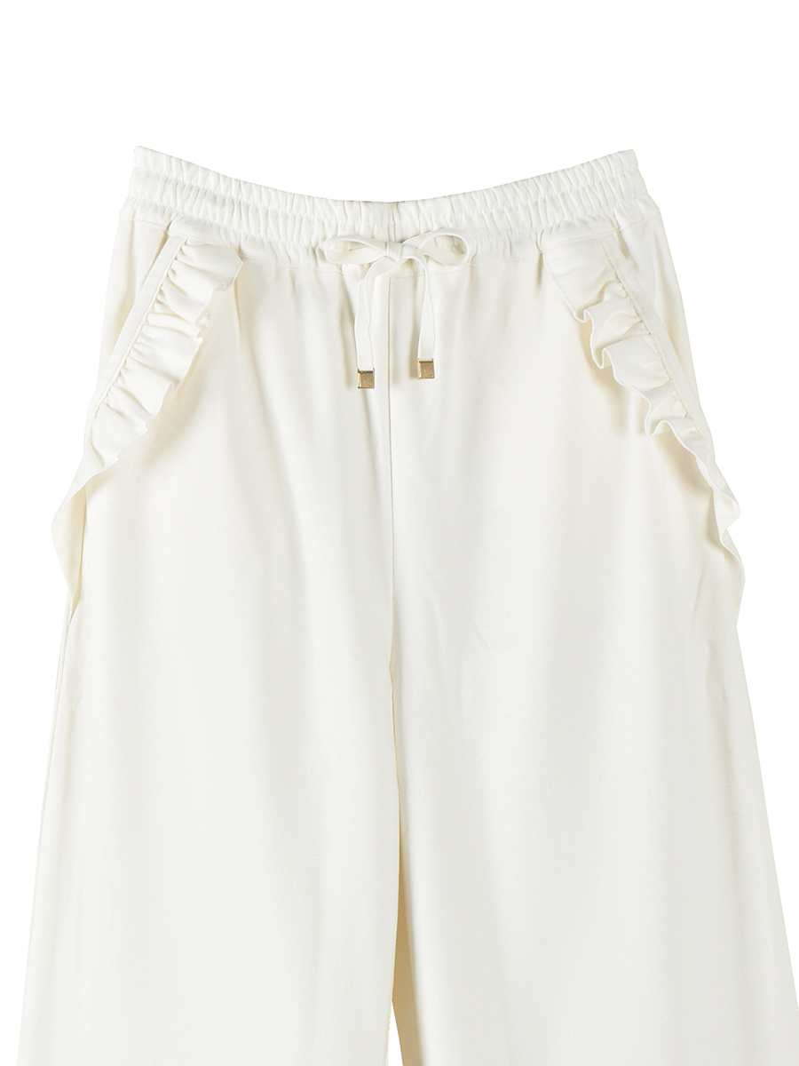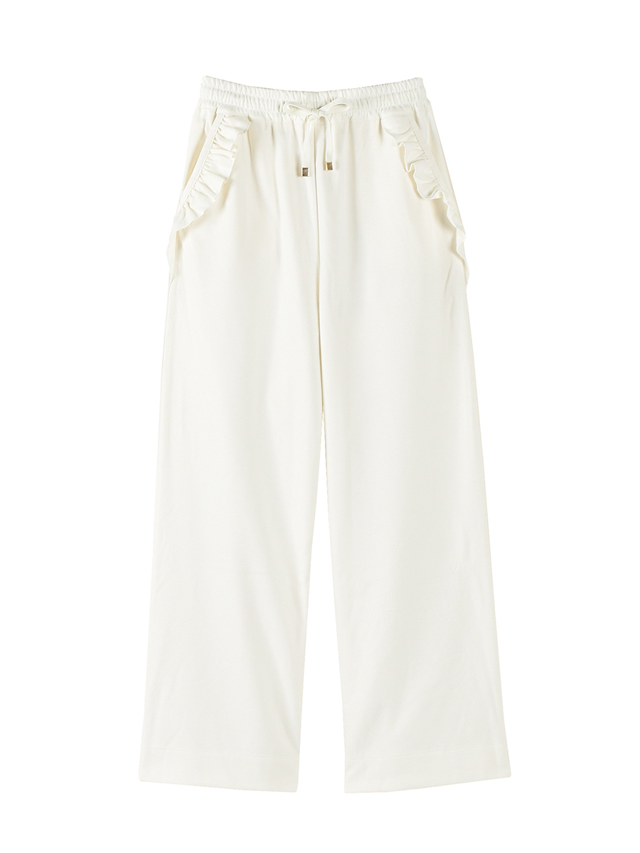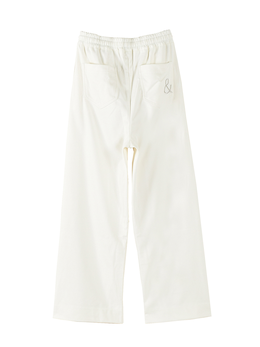 暖かみのある繊細で肌触りの良いストレッチフラノ素材です。裏起毛なので暖かくご着用いただけます。 前脇ポケット口はギャザーフリルで飾り付けられています。後ろのポケットには&の刺繍を微配色で入れています。 ウエストベルトにはヒモを通して調節可能にしています。ベルトにステッチを入れ生地とゴムを止め付けているので洗濯してもゴムが中でひっくり返らずに保てます。紐先には金属チップを付けて大人っぽい仕上がりにしています。 裾折り返し巾を広くしてしっかりと存在感のある裾に仕上げています。ゆったりと楽に着られるサイズ感です。