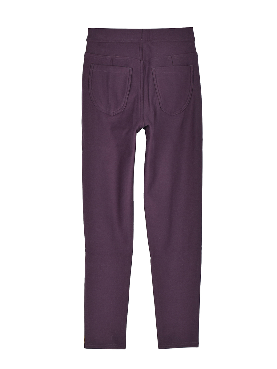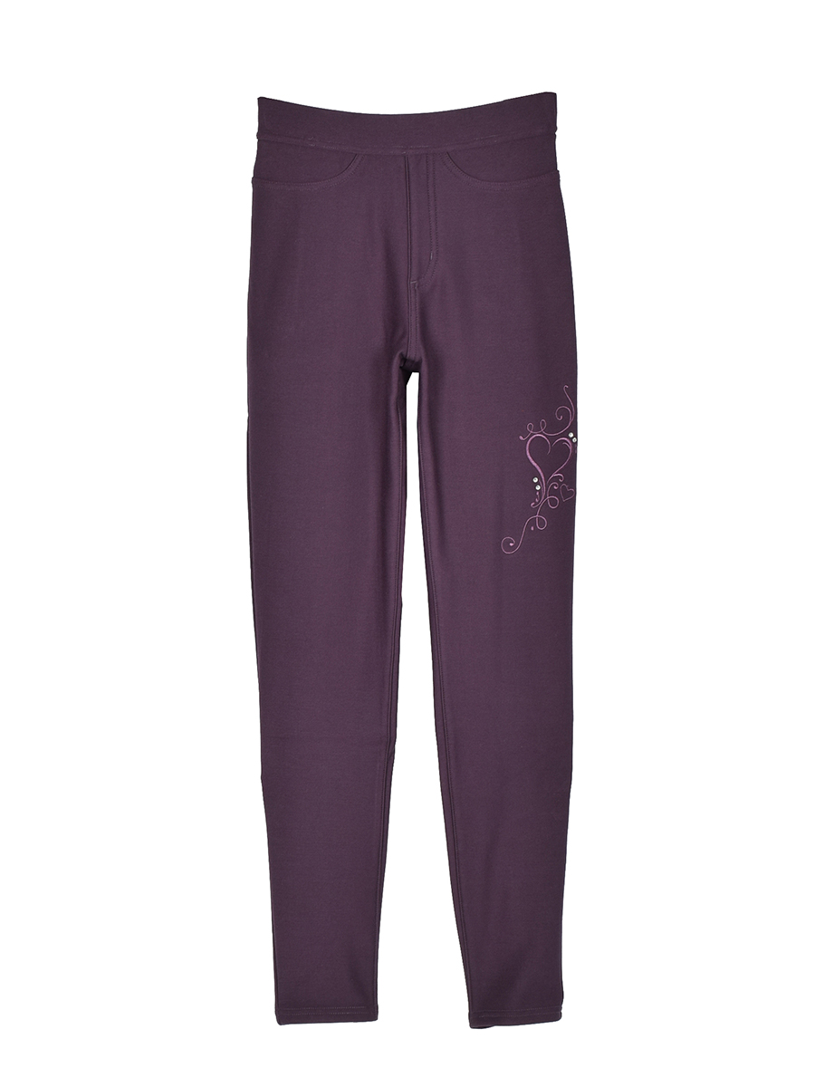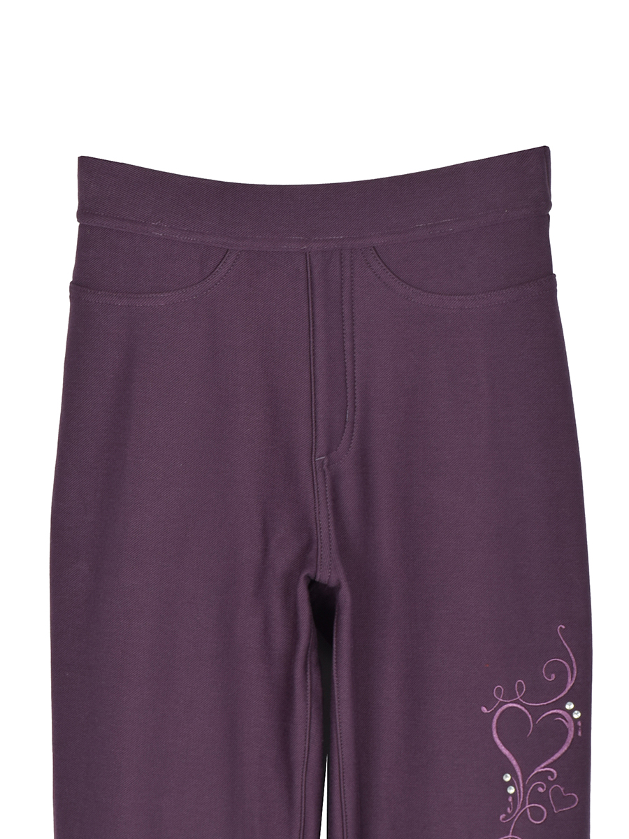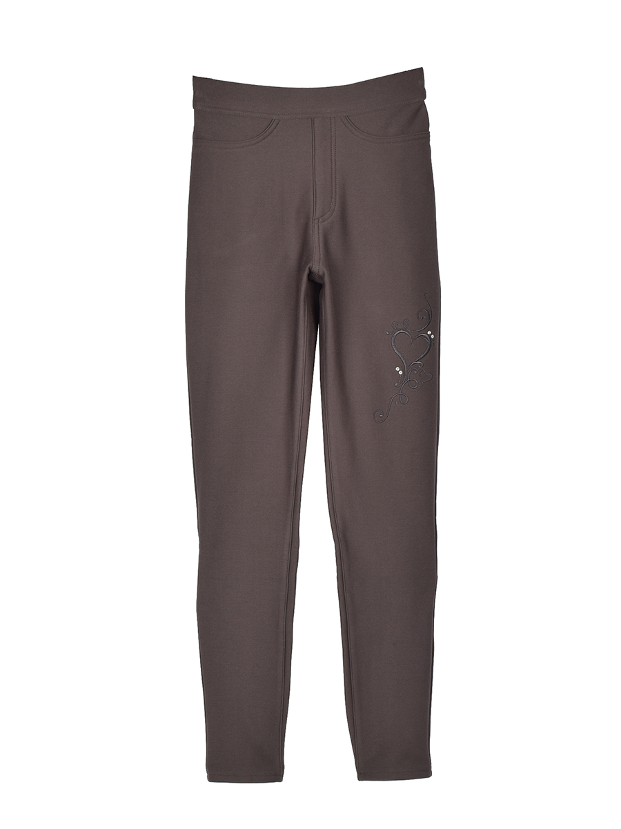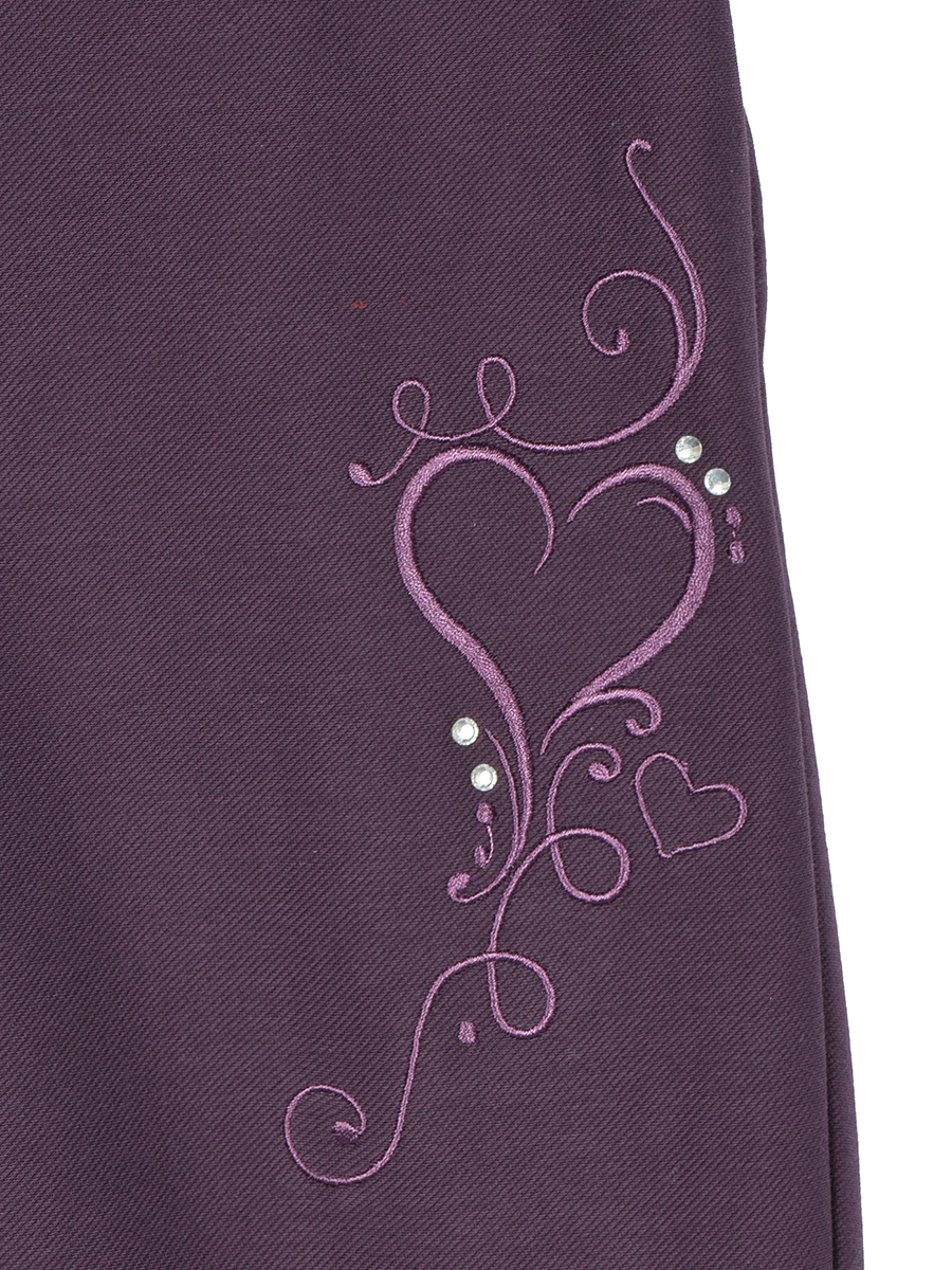 表と裏で組織の違う生地を貼り合わせたボンディング素材です。表は綾目組織のストレッチで裏は肌触り抜群のベロアです。軽くてお手入れしやすいです。 左ひざ上にハートをモチーフとした刺繍を入れ更にまわりをビジューで飾りました。チュニック丈の下からのぞく絶妙な位置に微配色の主張しすぎないさりげないポイントが可愛いパンツです。 プルオンスタイルでウエストベルト全体にゴムが入っているので楽に着られます。本体への付け方も伸びる仕様にしてストレッチ感を損なわないよう工夫されています。 前開き、前ポケットが飾りステッチで表現されています。長めの丈は、好きな位置にロールアップでき、足首が暖かいです。