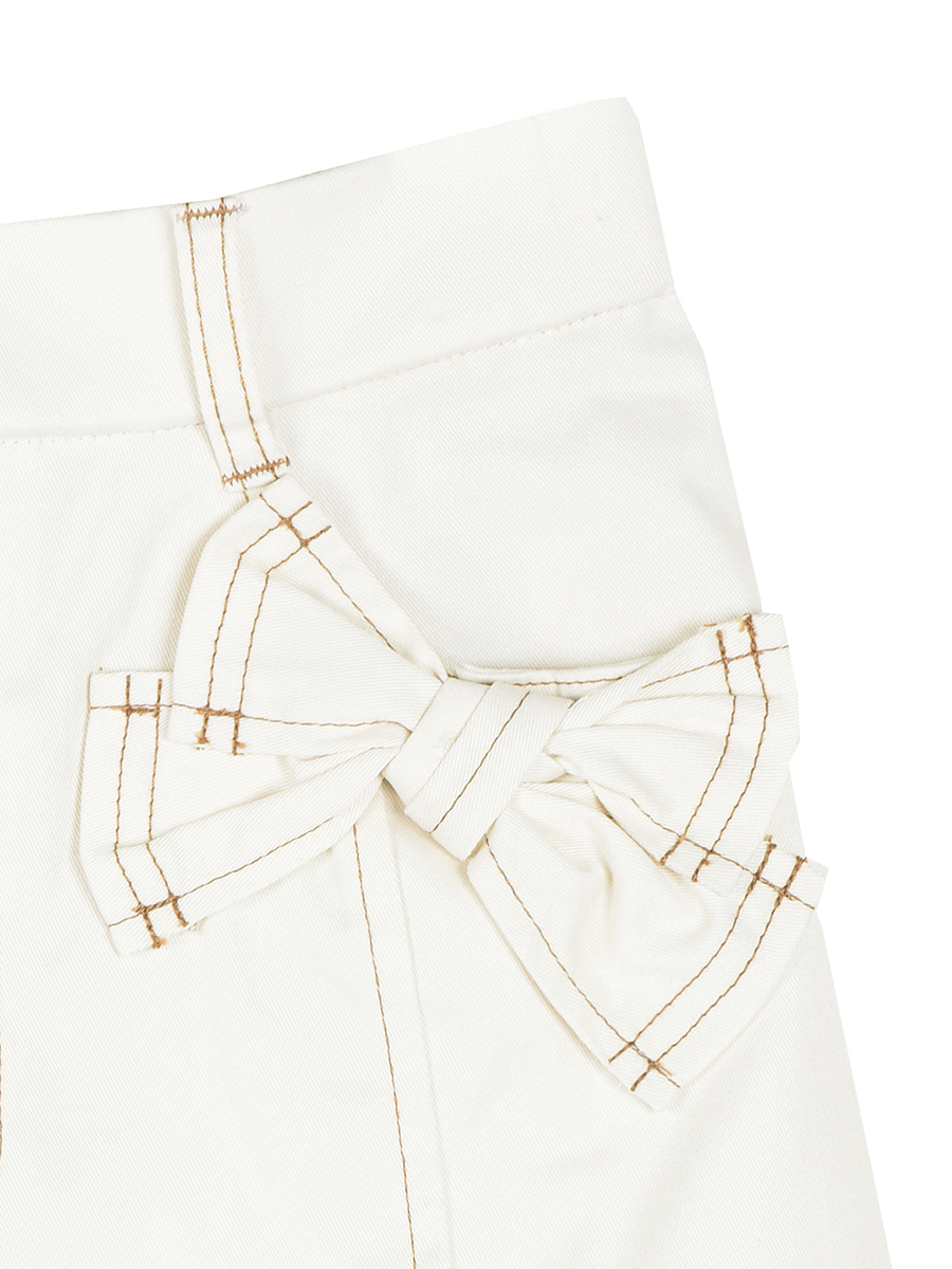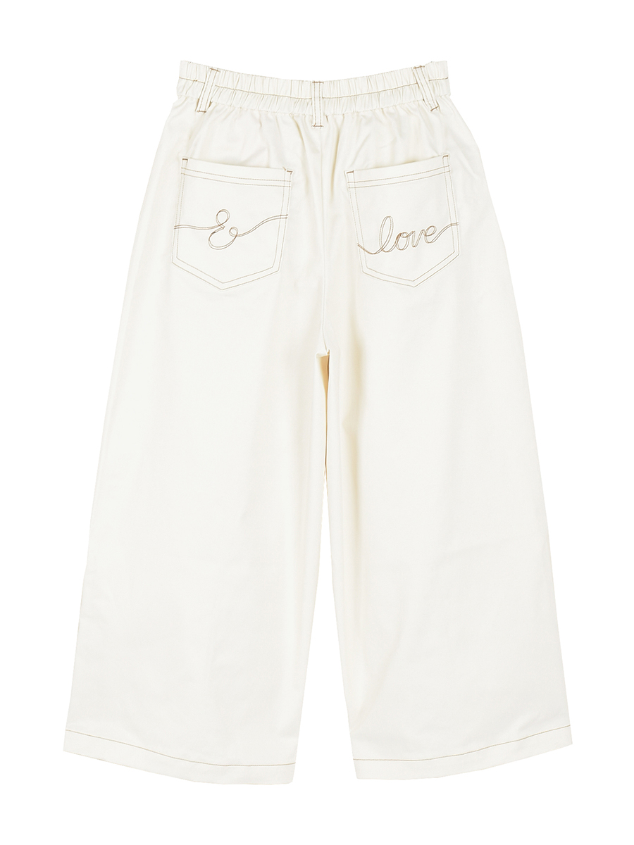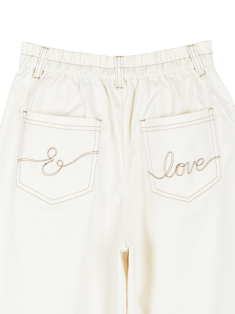 前腰ポケット口に共生地リボンを叩き、&LOVEらしさを添えたワイドパンツ。リボンはラフに結んだように見せて、実はきちんと形を整えて仕上げています。後ろポケットはシンプルなパッチポケットディティールですっきりとさせ、オリジナルのステッチ風刺繍を施しました