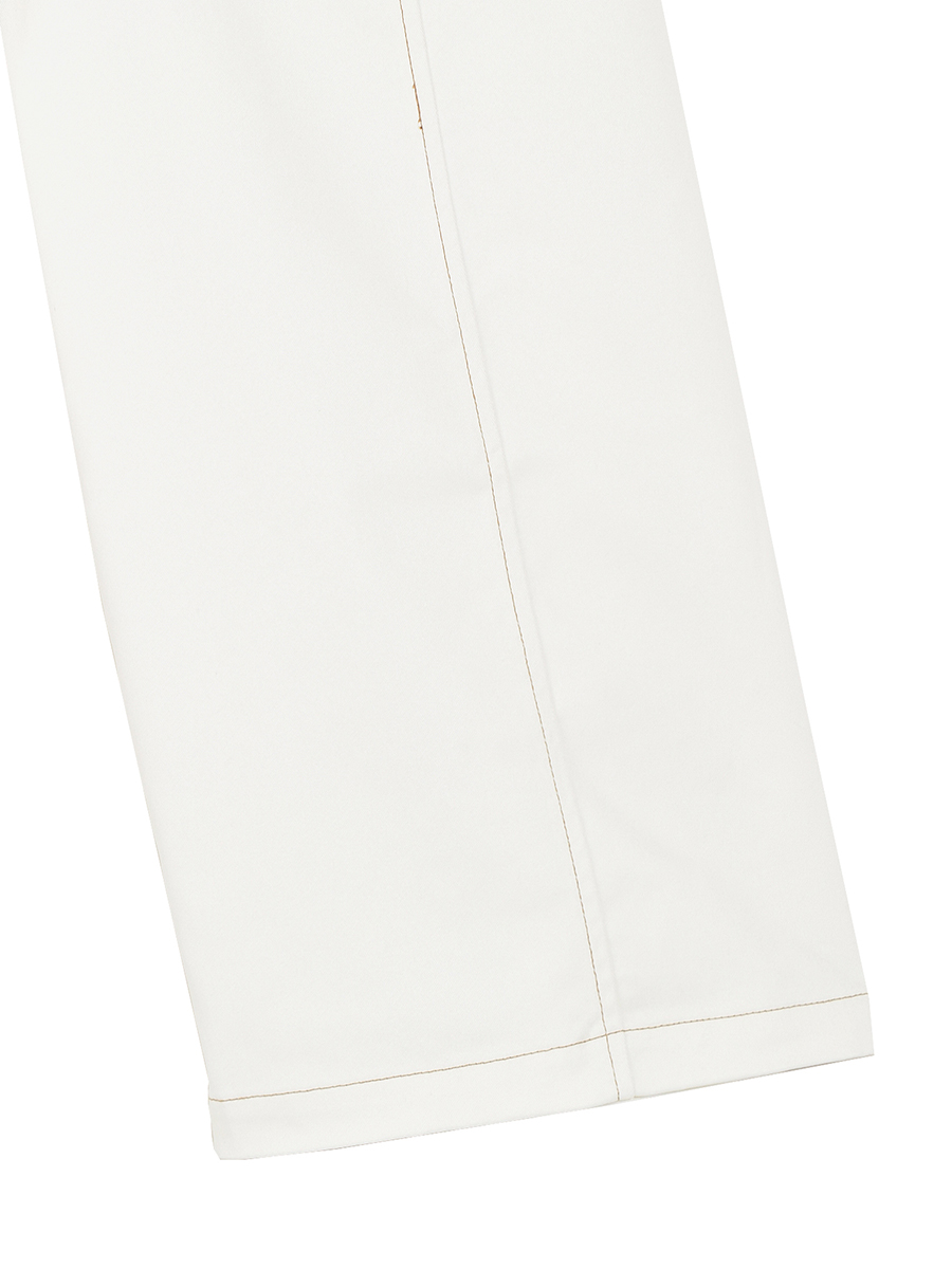 前パンツに施した切替えと配色ステッチもデザインポイント。カラーツイルは洗い加工無しできちんと感を出して仕上げました。ご自宅でのお洗濯で次第に柔らかく肌なじみが良くなり、自然なこなれ感がでてきます。程よい肉感とストレッチ感で穿きやすいです