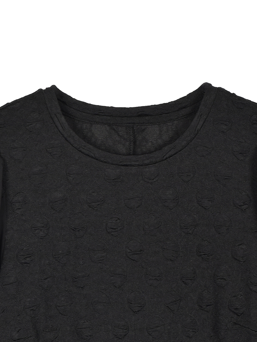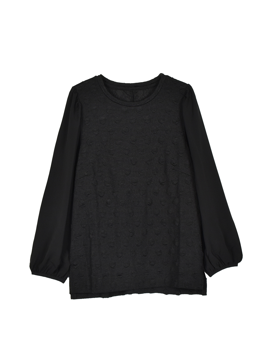 ・身頃はふくれジャカードで立体的なドット柄のカットソーです。袖はサラッとした落ち感のある布帛です。 ・身頃はバストダーツを入れ、背中心線をハギにして女性らしい立体的なフォルムに仕上げています。伸縮性のあるカットソージャカードなので楽に着用いただけます。袖はエレガントな雰囲気の布帛にボリュームある袖口で&LOVEらしい異素材コンビのプルオーバーです。 ・裾は少し前後差をつけてスリットを入れています。折り返しを広めにとり裾を出してもきちんとした印象で着られます。 ・後衿ぐりをバインダーで包み衿ぐりが型崩れしにくいようにしています。