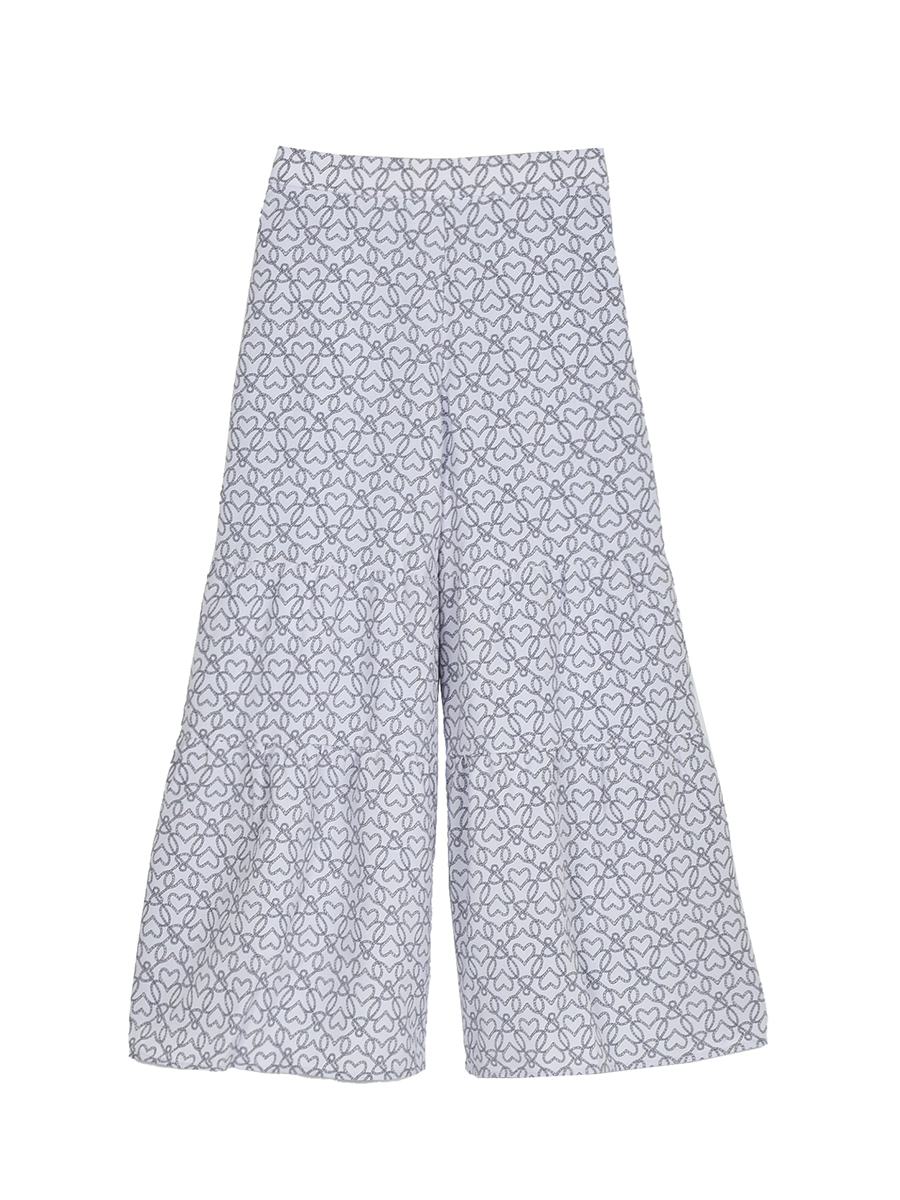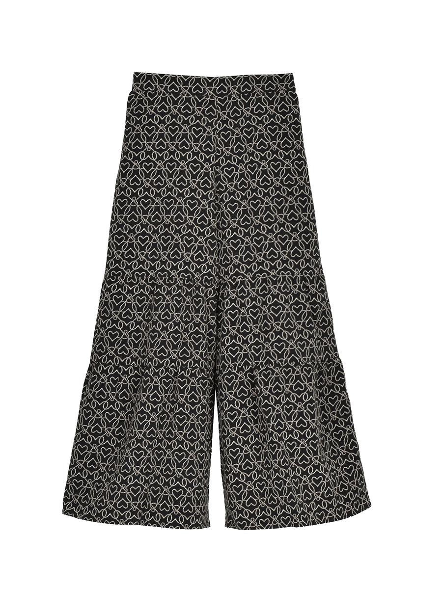 ティアードディティールのクロップド丈のワイドパンツはスカート見えする様にふんわりと仕上げました。2段のティアードディティールは広がり過ぎないさりげないギャザー感でお作りしています。横幅を押さえるために脇とまた下部分にはギャザーを入れず、ふんわり感をキープしつつ、すっきりと仕上がる様に調整しています。裏地は柔らかい風合いでストレスフリーな着用感で淡いカラーの表地でも下着が透けにくい程よい肉感です。両脇にシームポケットを施しています。デザインを邪魔さず、実用的にお作りしました。シワになりにくく吸水性、速乾性も兼ね備えております。ピリングになりにくいのも特徴です。UVカット機能もあり、日差しをカバーしてくれます。