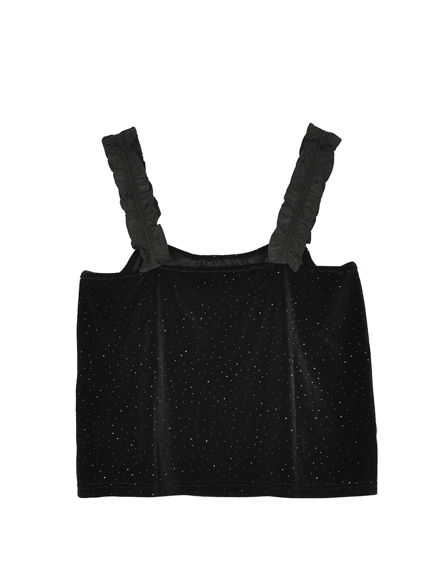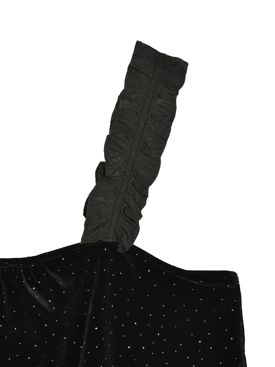 素材は柔らかなベロア素材を使用しております。表面が滑らかで触り心地良く、独特の光沢感があります。 全面グリッターラメドットプリントです。胸元はゆるめフィットから裾にかけて広がるAラインのシルエットになっております。 肩紐は別素材タフタを使用して贅沢ギャザーフリルになっております。前胸のみ胸元ギャザーを寄せております。裾両サイドはスリットデザインとなっております。