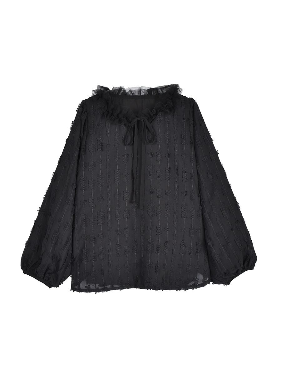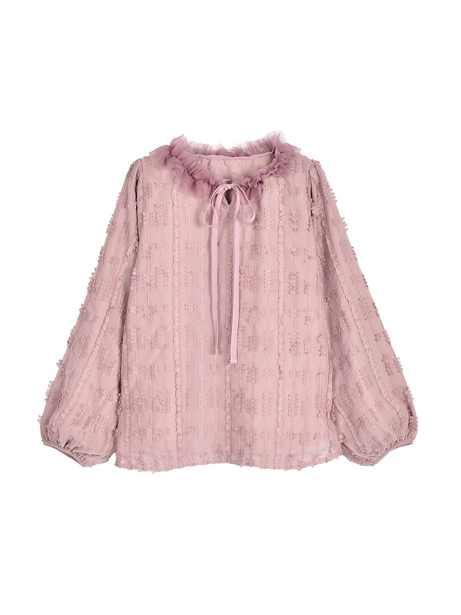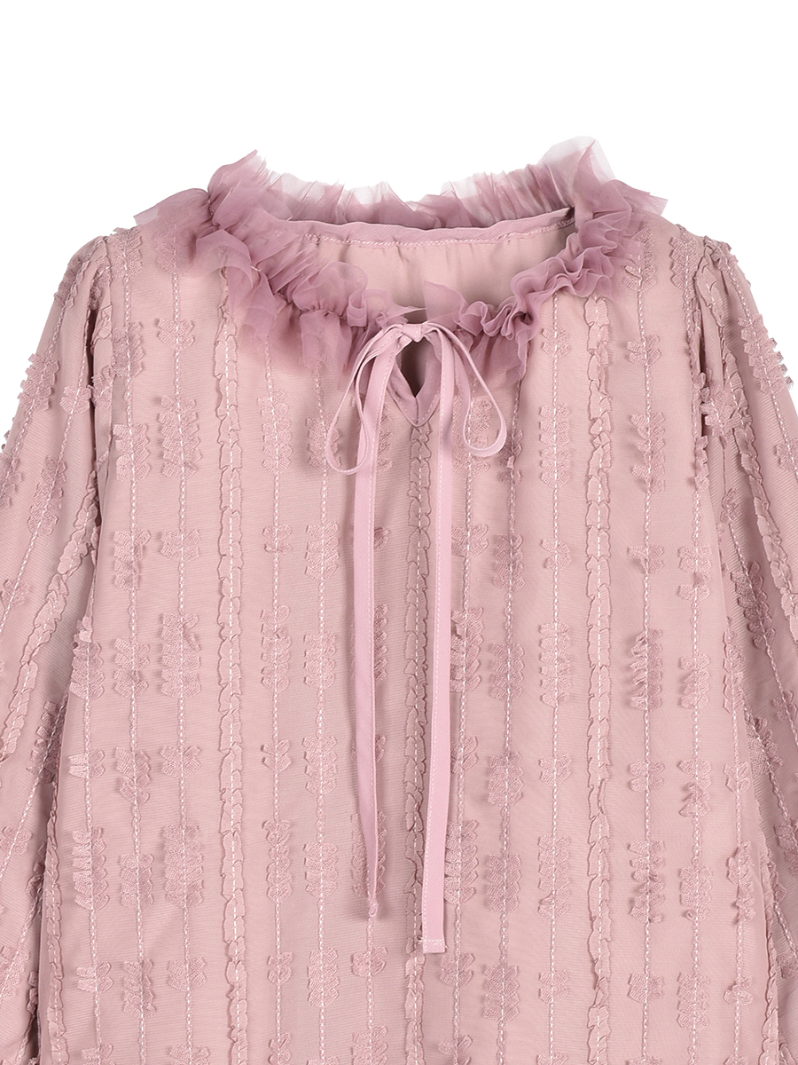 シアー感のある生地にリボンが飾られた立体感のある本体生地にフリルはチュールを使用しています。ボックスシルエットに&LOVEらしく衿にフリルをあしらい、袖口をパフスリーブに仕上げています。段違いのチュールフリルを衿元に付けました。そのままで着てもハイネックのインナーと重ねて着てもオシャレに着こなせます。衿元に付いた紐でスタイリングのバリエーションも楽しめます。