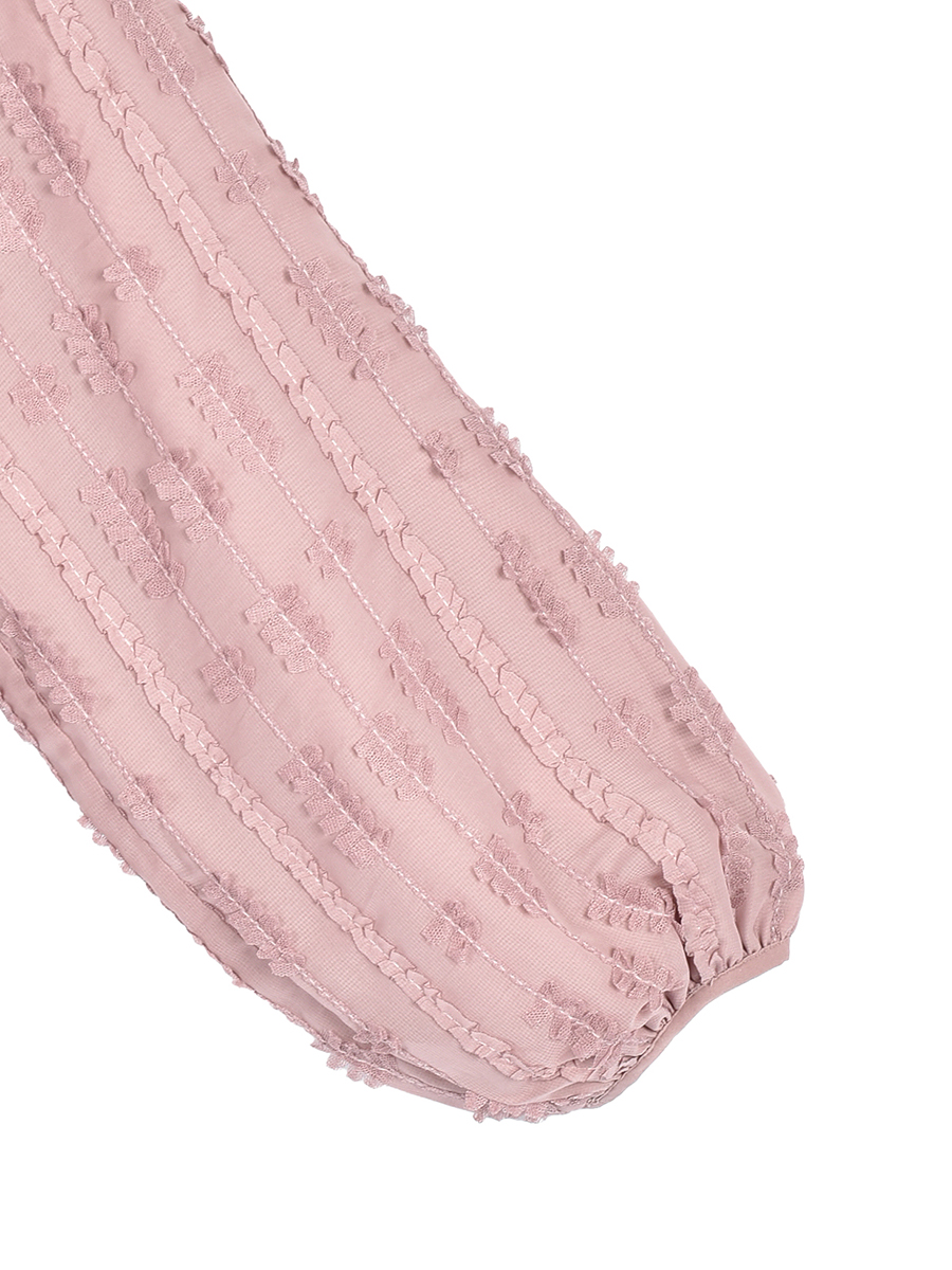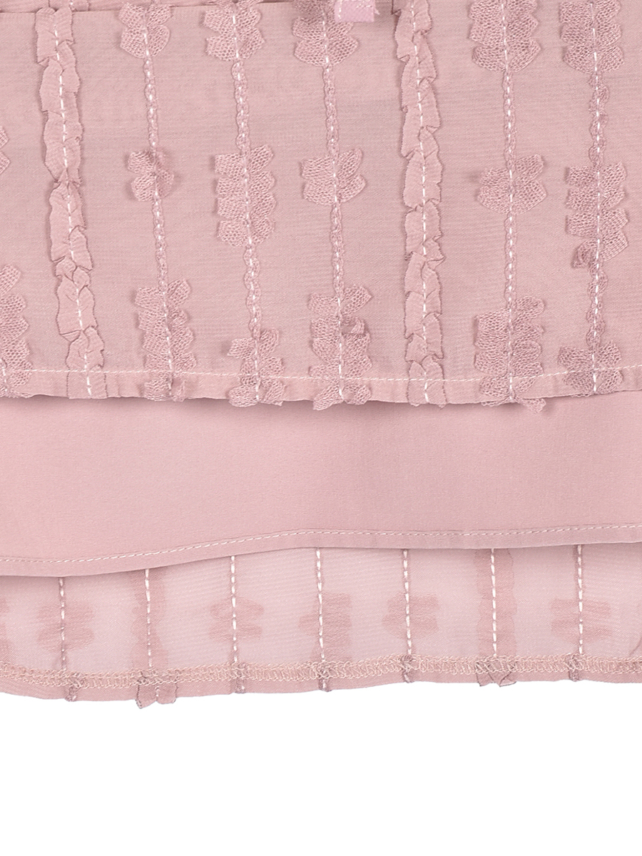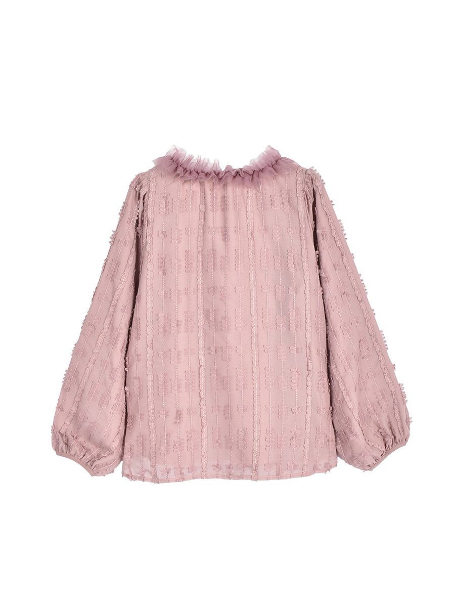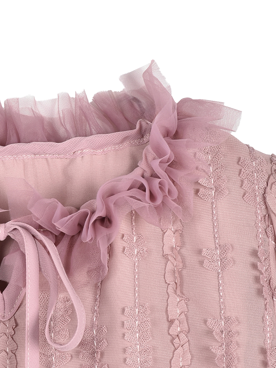 シアー感のある生地にリボンが飾られた立体感のある本体生地にフリルはチュールを使用しています。ボックスシルエットに&LOVEらしく衿にフリルをあしらい、袖口をパフスリーブに仕上げています。段違いのチュールフリルを衿元に付けました。そのままで着てもハイネックのインナーと重ねて着てもオシャレに着こなせます。衿元に付いた紐でスタイリングのバリエーションも楽しめます。