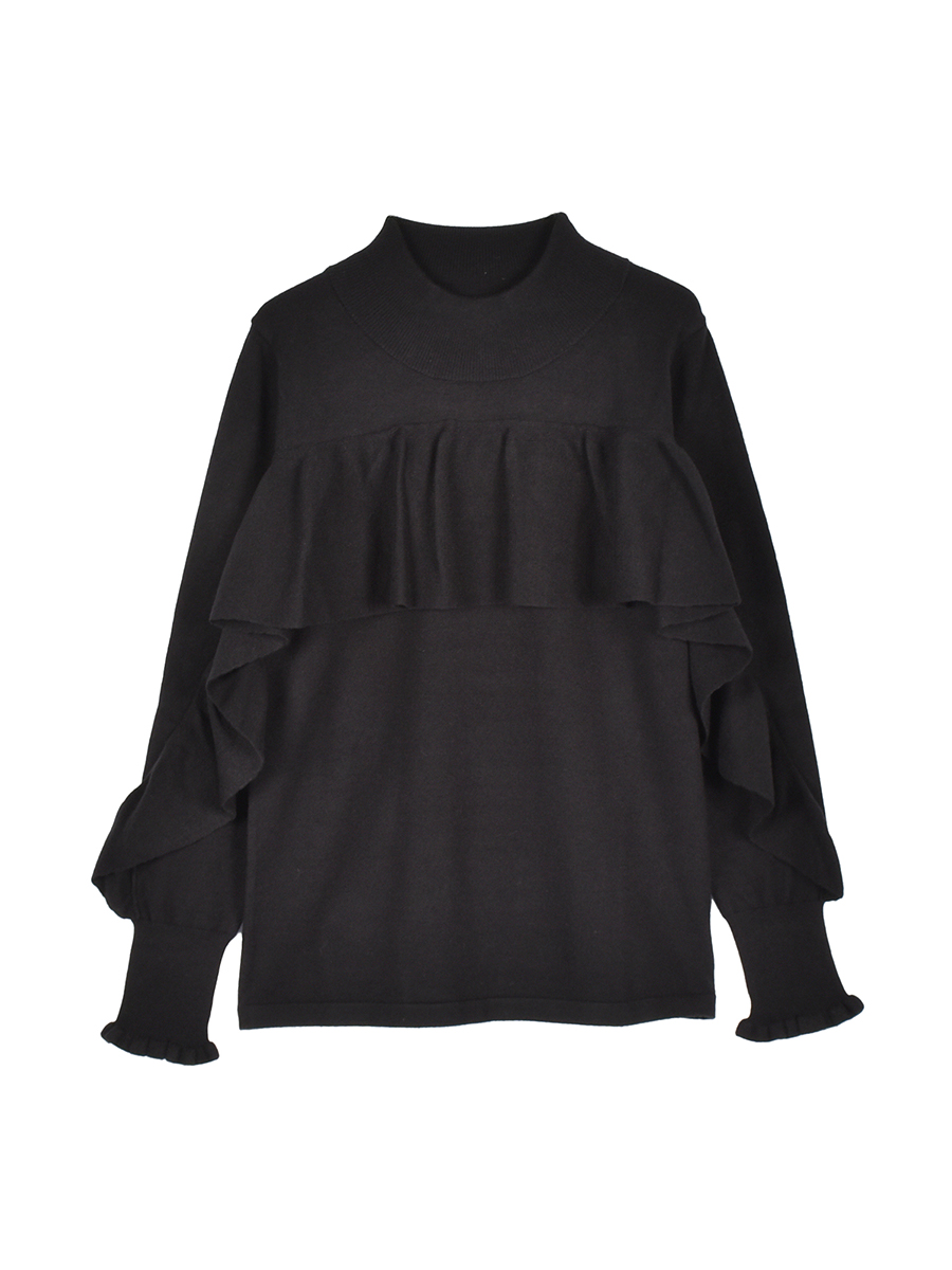 左袖口~右袖口へと大胆に続くラッフルフリルが目を引く一枚です。様々なアイテムと合わせやく、コーデの幅も広がります。