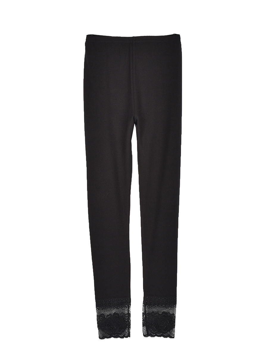 サラッとした穿き心地でキックバックのしっかりしたカットソー生地です。足にピタッとフィットするシルエットです。裾をストレッチレースで切り替えています。足元まで華やかに見せてくれます。様々なアイテムと合わせやすくコーデの幅も広がります。ウエストはゴムも一緒に縫い込まれたスッキリしたウエスト周りに仕立てています。