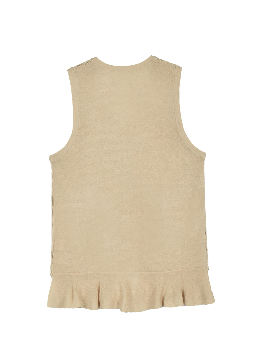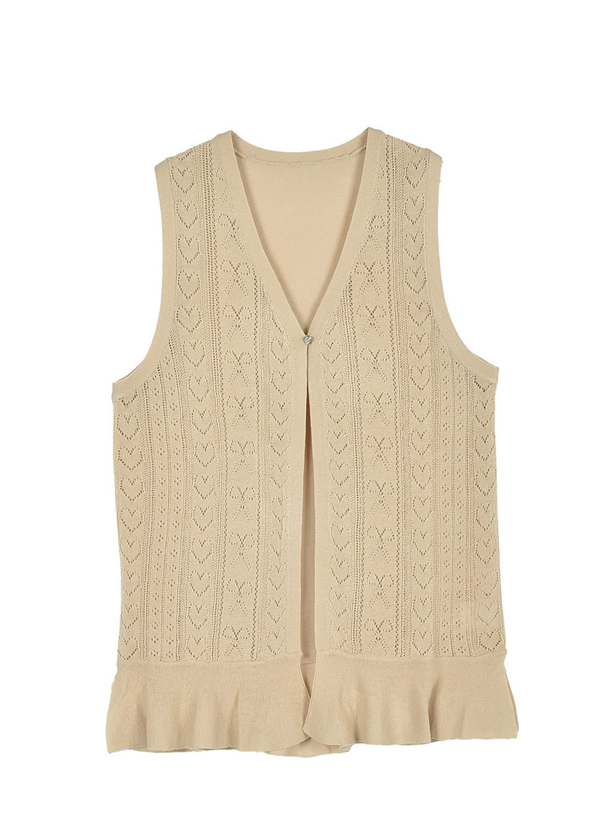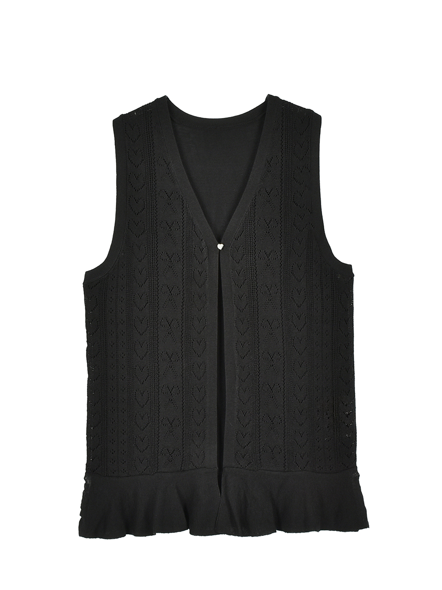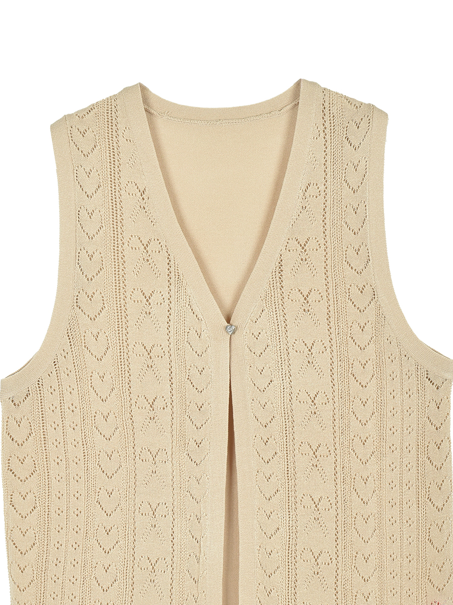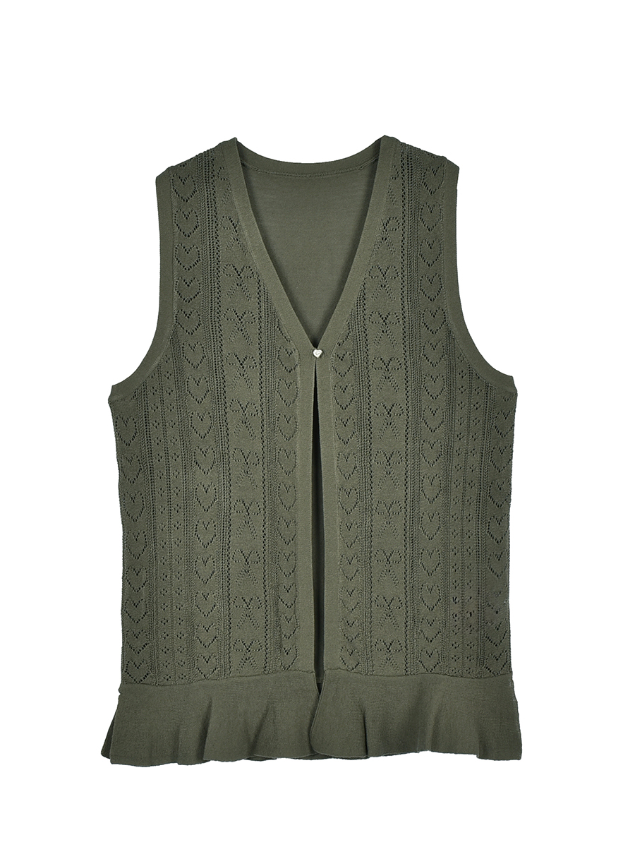 前身頃は透かし柄で軽やかに、後身頃は天竺編みでお作りしています。裾の総針フリルはひらりと広がり大人可愛いシルエットになっています。こだわりの柄にはリボン柄とハート柄を入れて&LOVEらしいラブリーさを表現しています。釦はハートのキラキラビジュー釦を使用しています。
